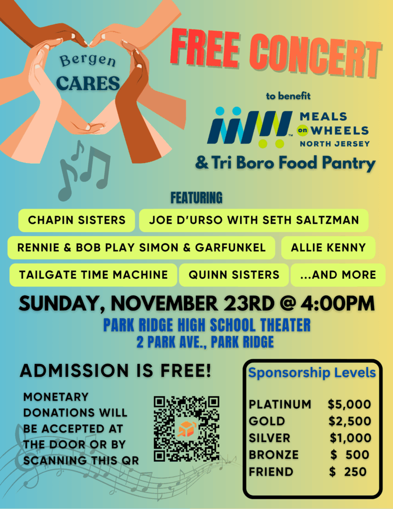Join us for an inspiring evening of music and community at the “Bergen Cares” Benefit Concert, taking place on Sunday, November 23 at 4:00 PM at the Park Ridge High School Theater, located at 2 W. Park Ave, Park Ridge, NJ.