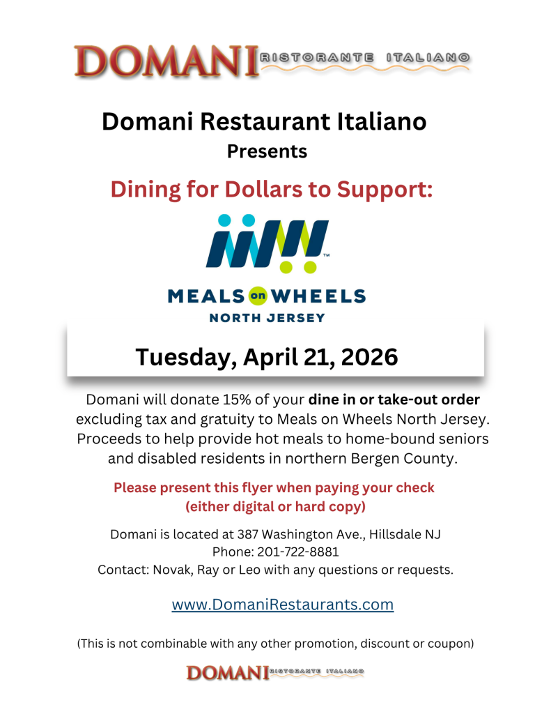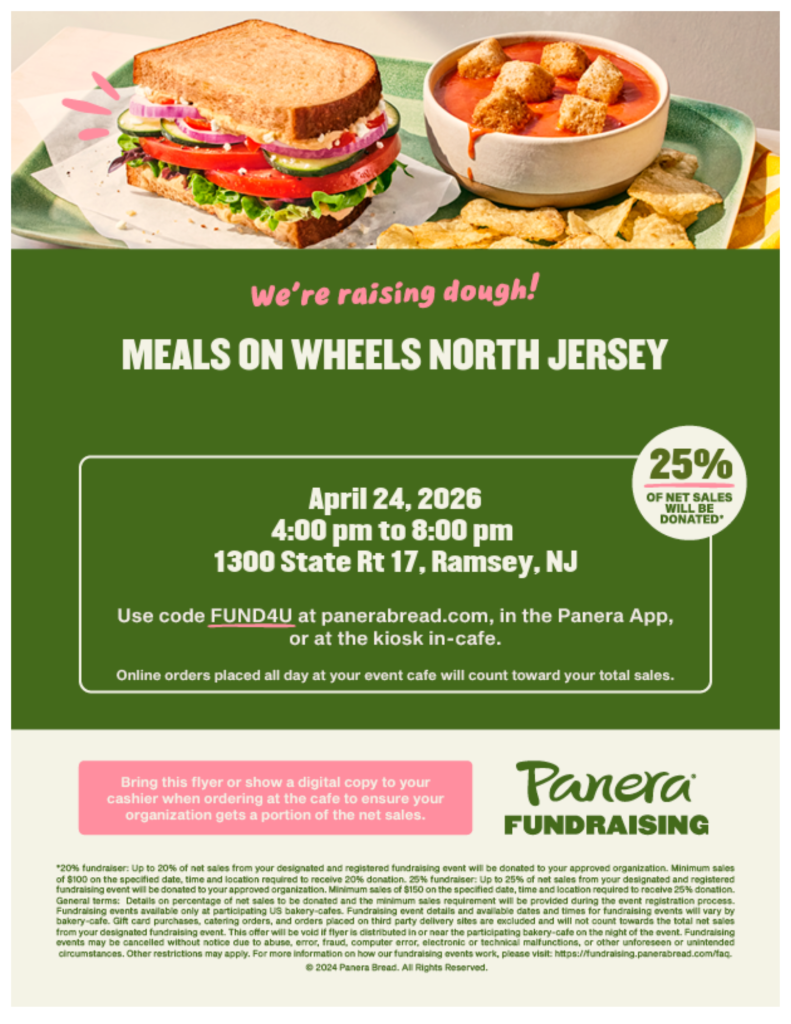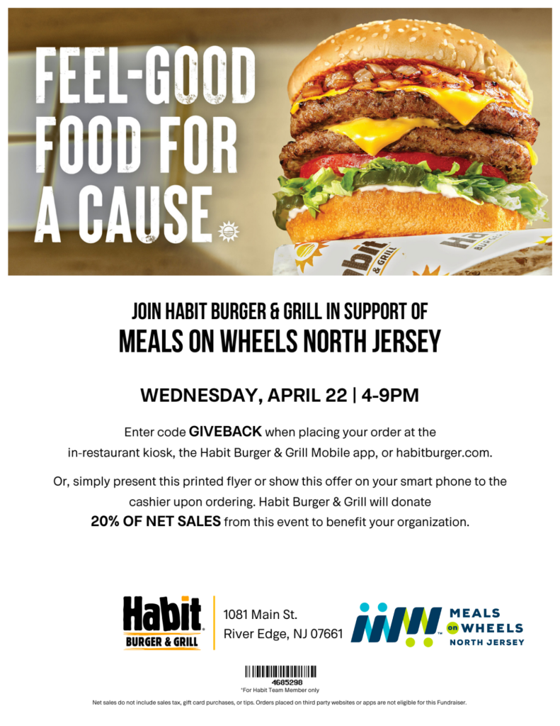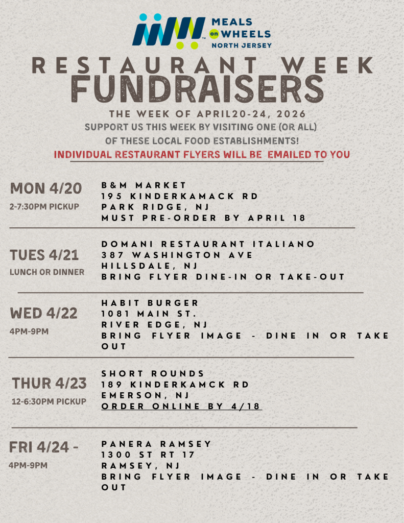 Join Us for Restaurant Week and support Meals on Wheels North Jersey! From April 20-24, 2026, indulge in delicious dining experiences while supporting a vital cause! Meals on Wheels North Jersey is thrilled to announce the return of our Restaurant Week Fundraiser. Throughout the week, participating restaurants will generously donate a portion of their proceeds to help us deliver vital meals and services to homebound seniors in our community.